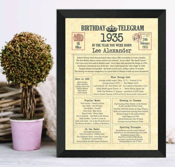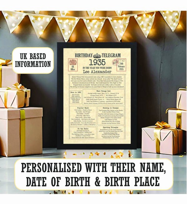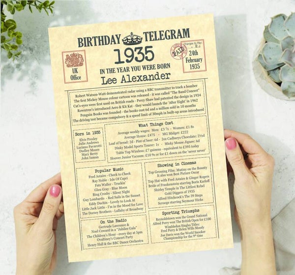 Give them a Nostalgic Journey through time with this Personalised 90th Birthday Gift - a 1935 Day You Were Born Print packed full of more than 50 facts & events from when they were born