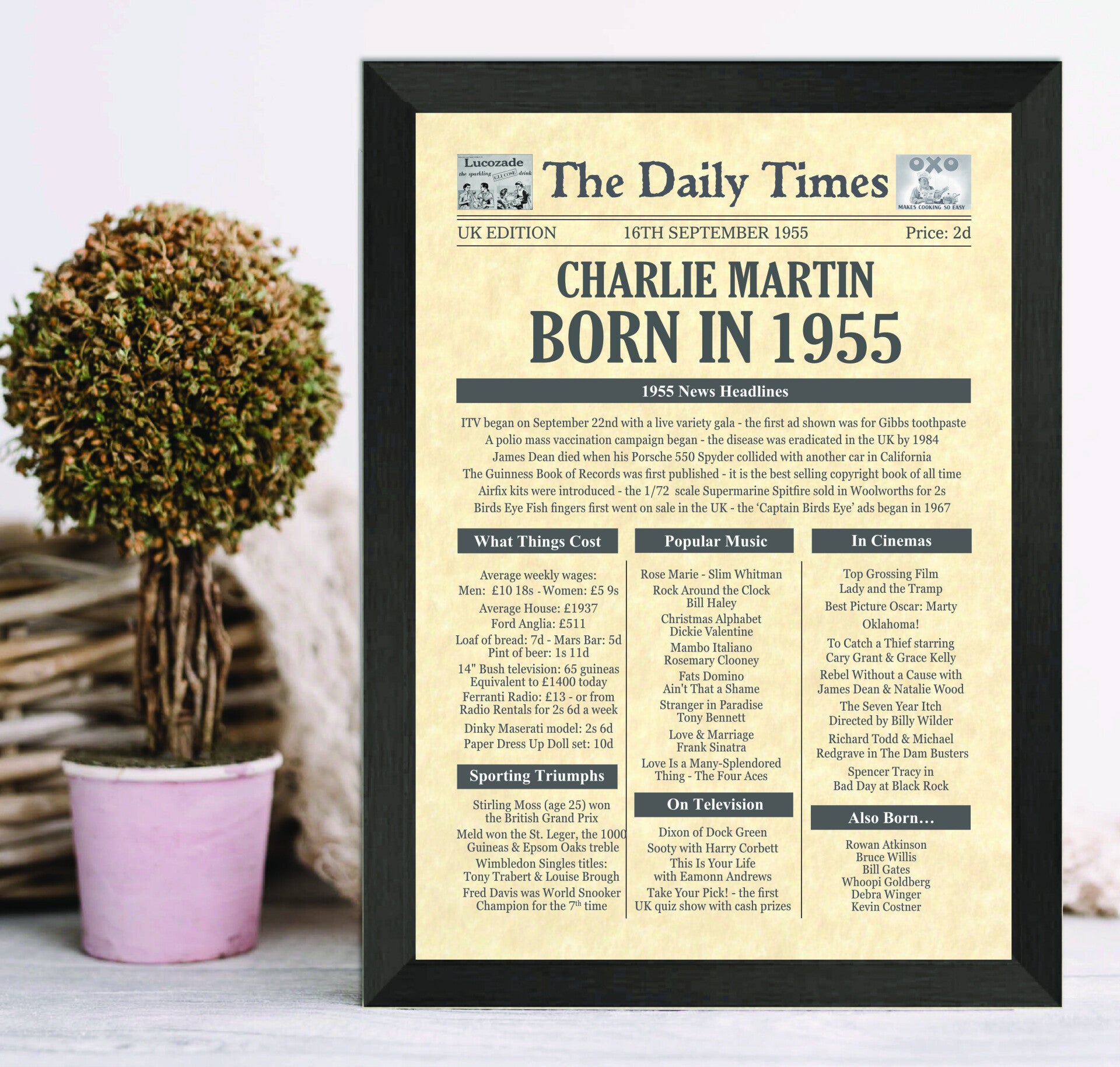 Give them a Nostalgic Journey through time with this Personalised 70th Birthday Gift - a 1955 Day You Were Born Photo Print packed full of more than 50 facts & events from when they were born
