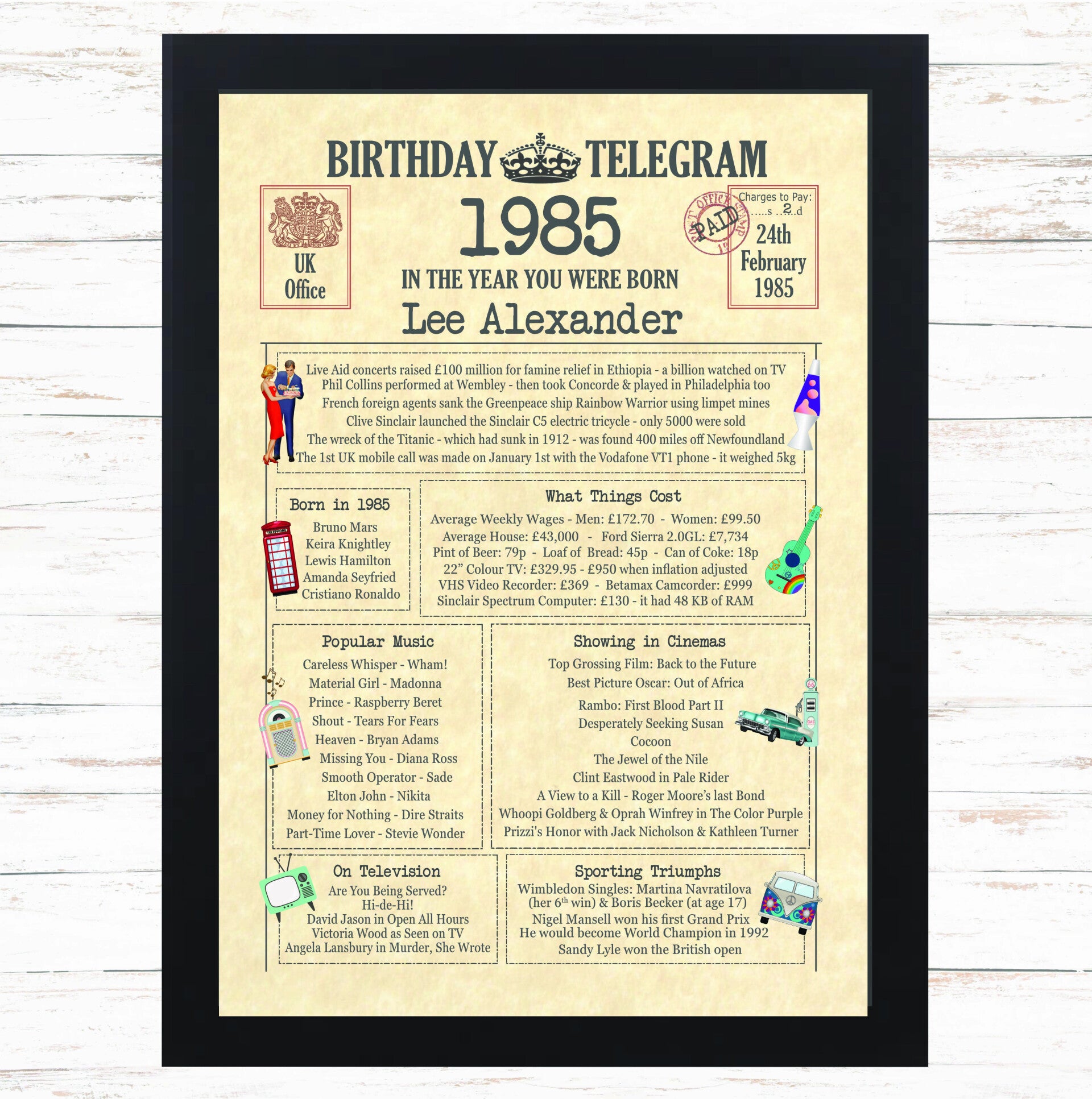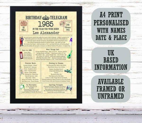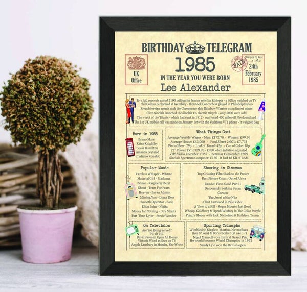 Give them a Nostalgic Journey through time with this Personalised 40th Birthday Gift - a 1985 Day You Were Born Print packed full of more than 50 facts & events from when they were born