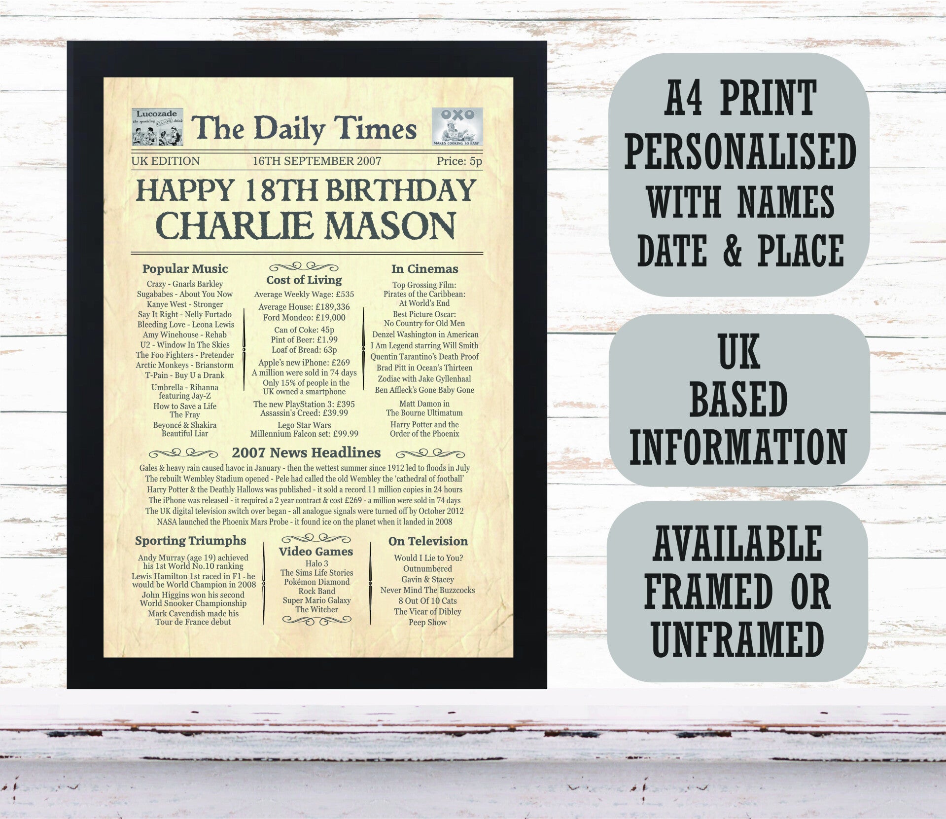 Give them a Nostalgic Journey through time with this Personalised 18th Birthday Gift - a 2007 Day You Were Born Print packed full of more than 50 facts & events from when they were born