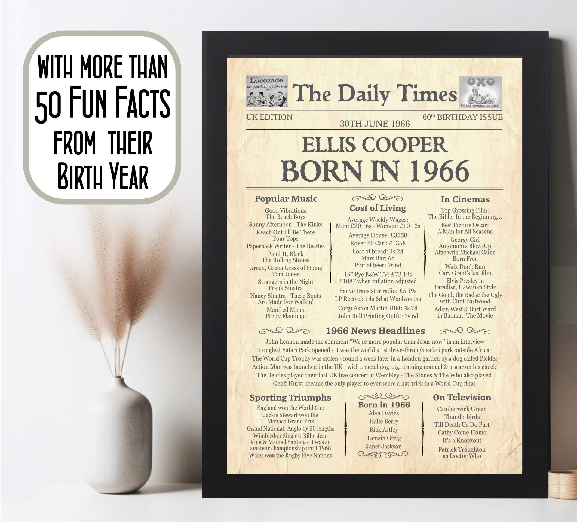 Give them a Nostalgic Journey through time with this Personalised Birthday Gift - a Day You Were Born Print packed full of more than 50 facts & events from when they were born