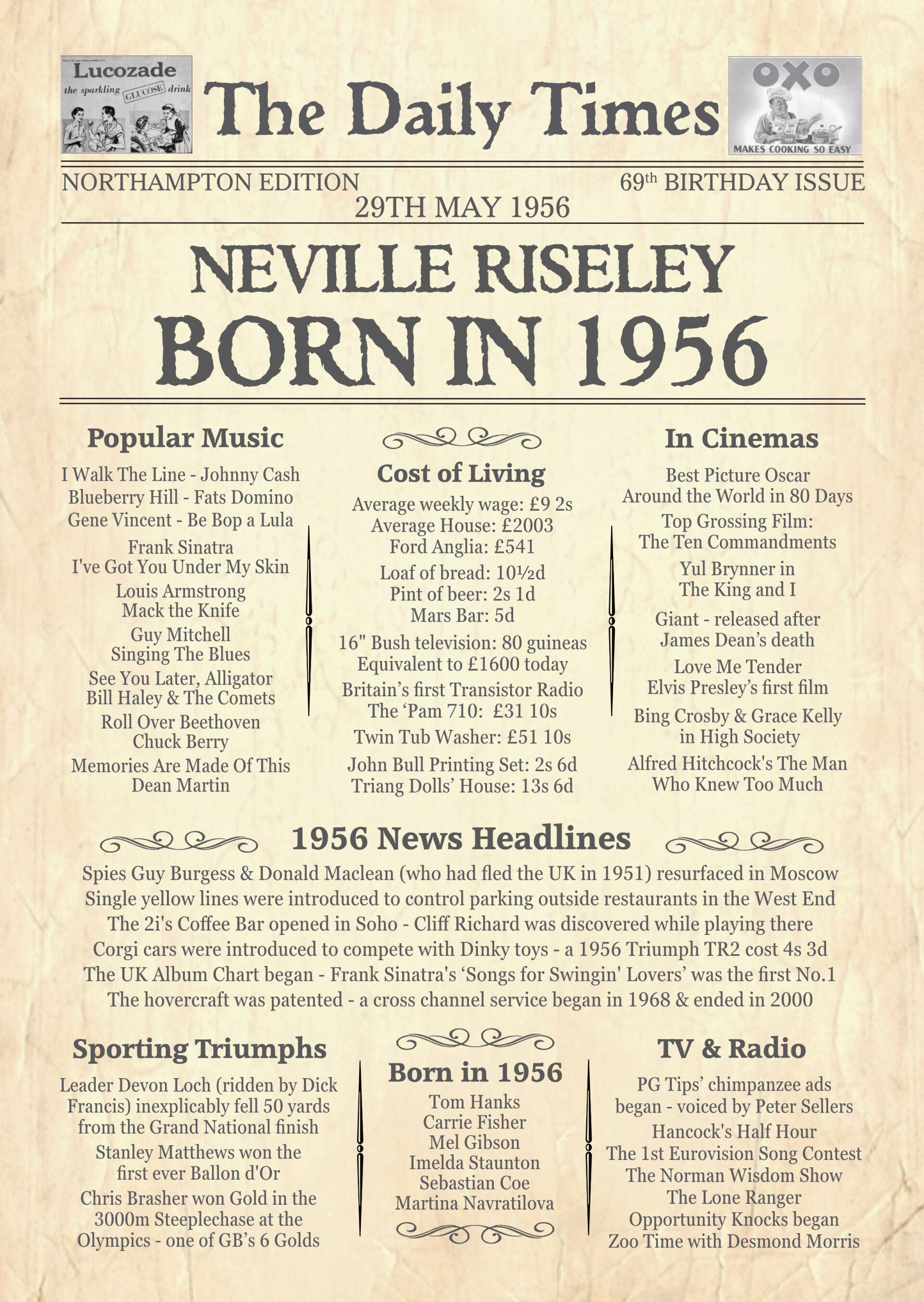 You will receive a high-quality A4 print packed with more than 50 interesting facts, news & information from when they were born - personalised with your loved one’s NAME & BIRTH DATE - I can add their BIRTHPLACE if you wish