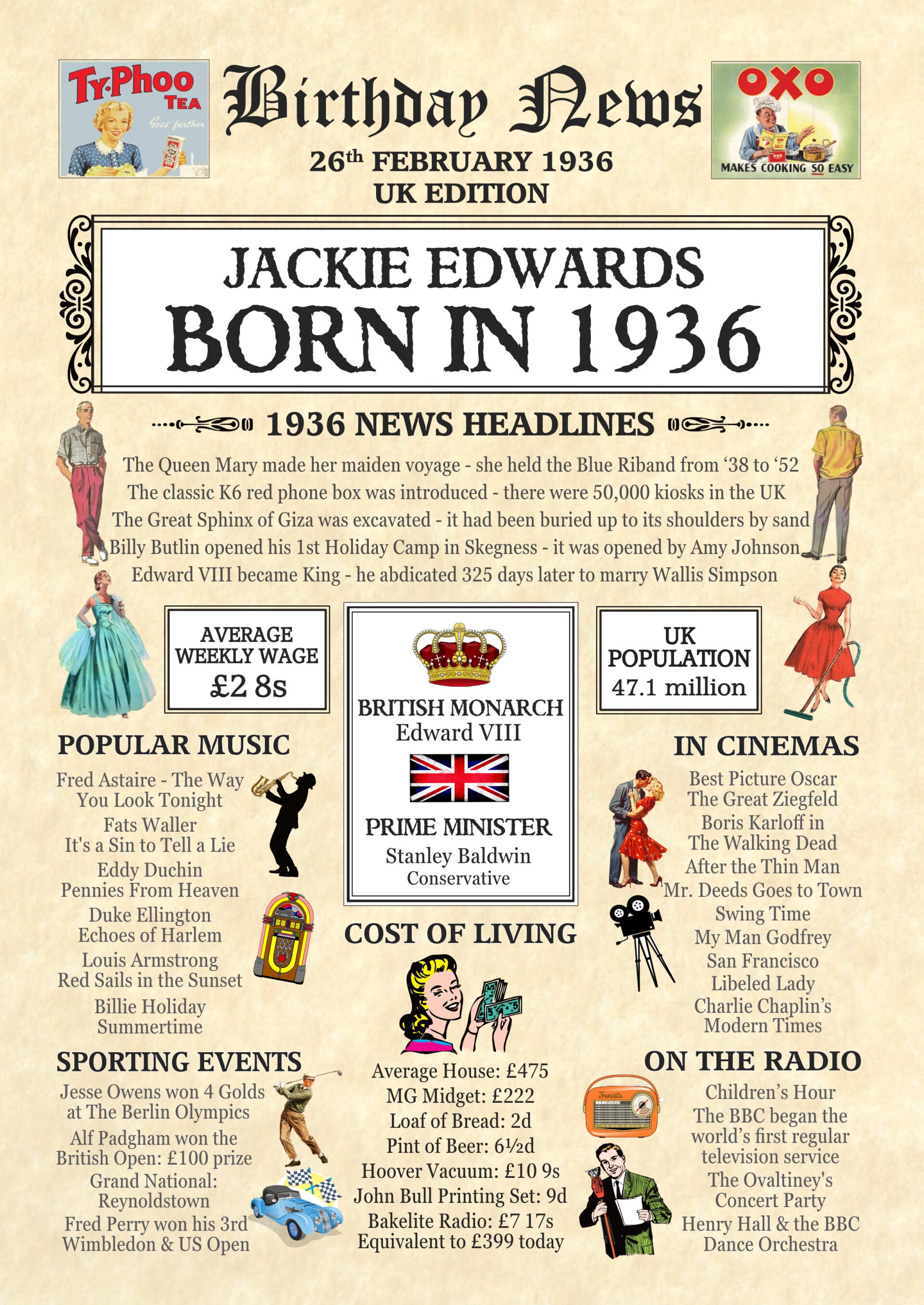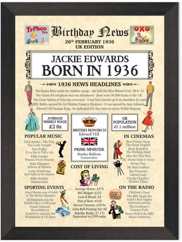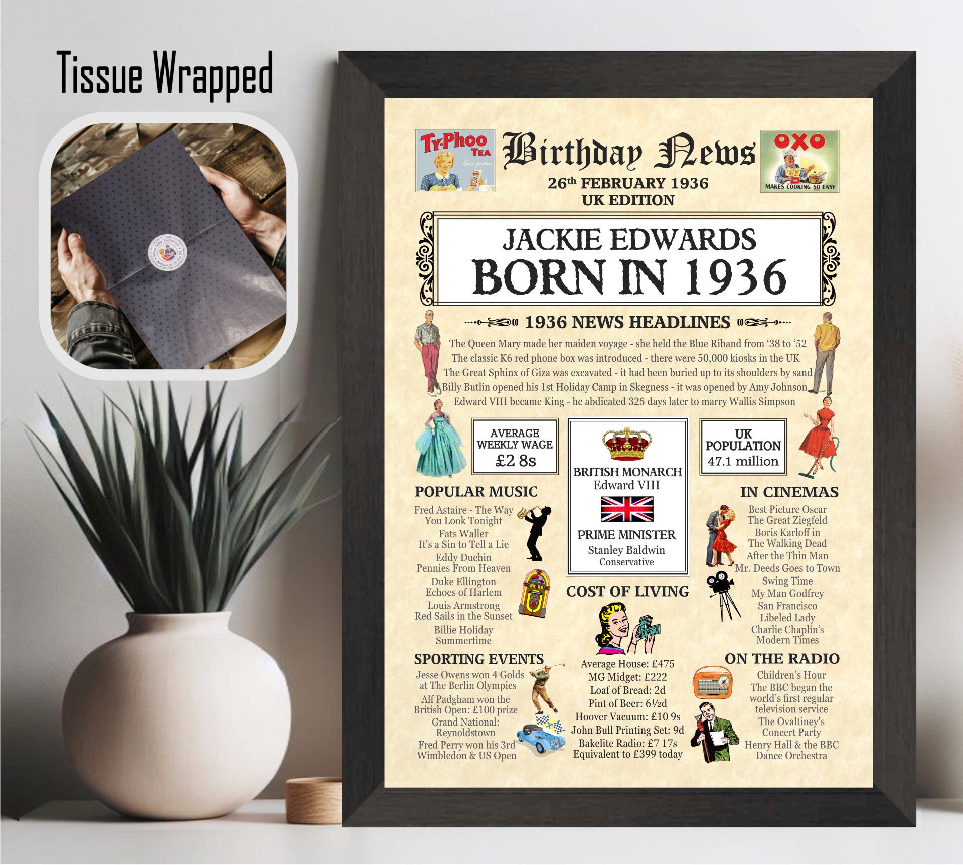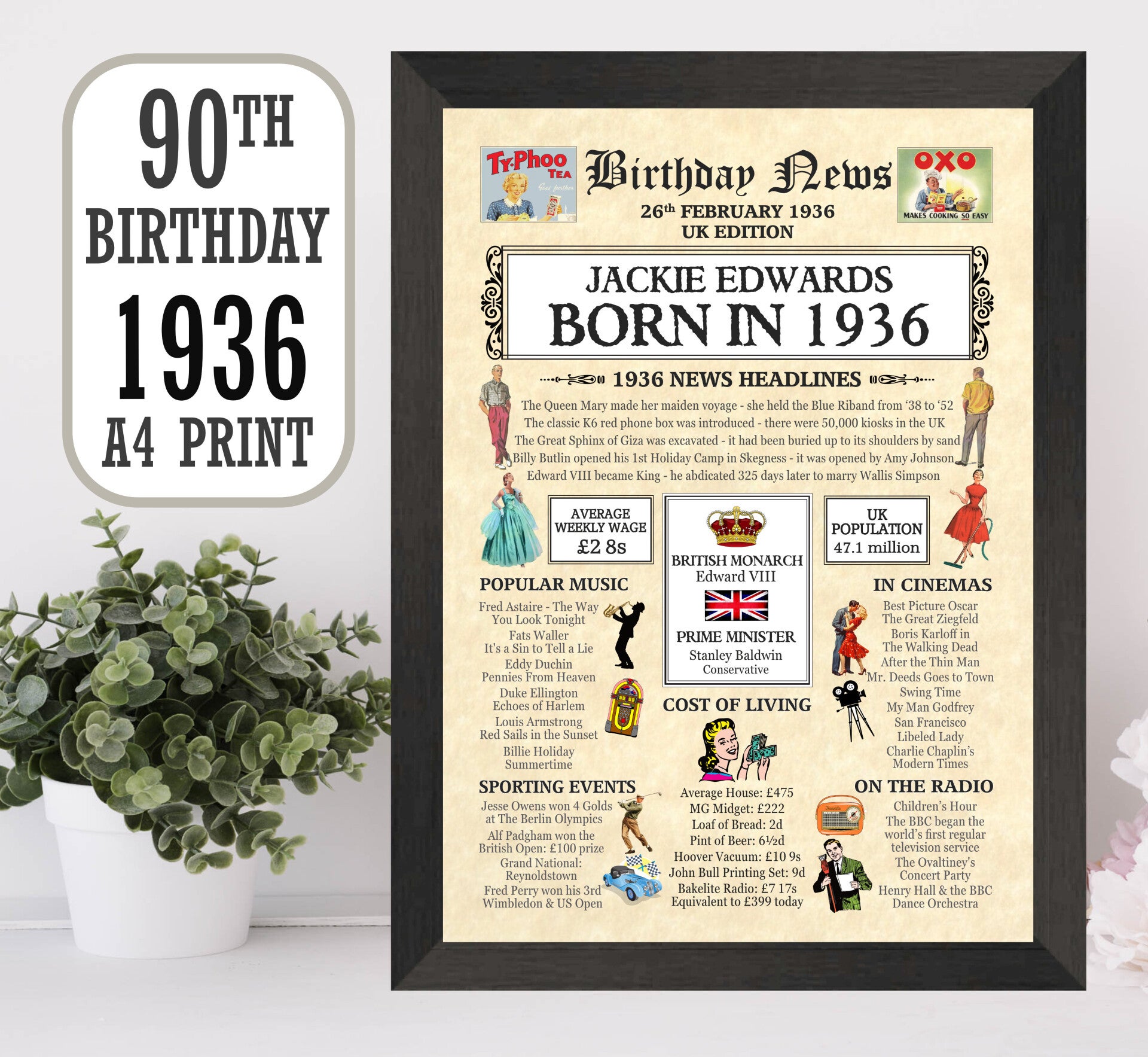 Give them a Nostalgic Journey through time with this Personalised 90th Birthday Gift - a 1936 Day You Were Born Print packed full of more than 50 facts & events from when they were born