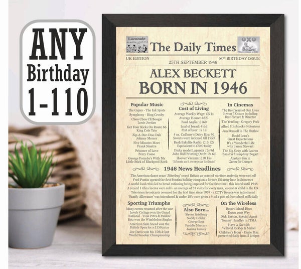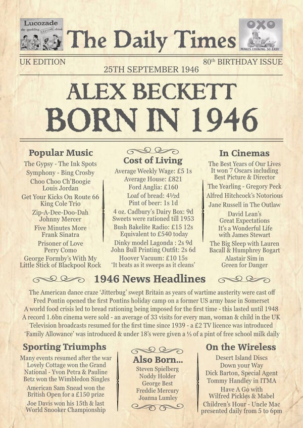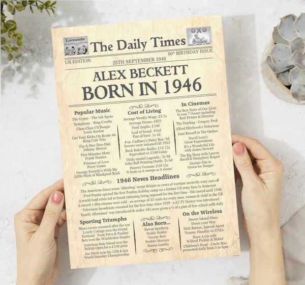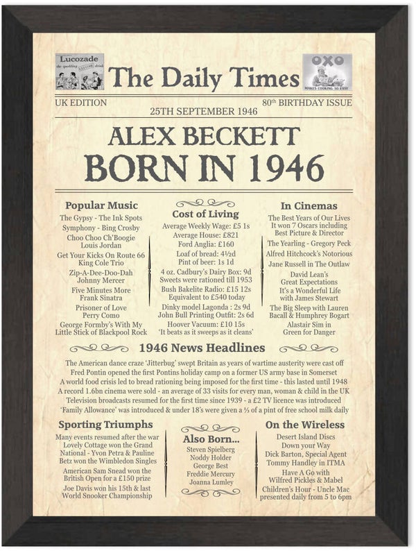 Give them a Nostalgic Journey through time with this Personalised 80th Birthday Photo Gift - a 1946 Day You Were Born Print packed full of more than 50 facts & events from when they were born