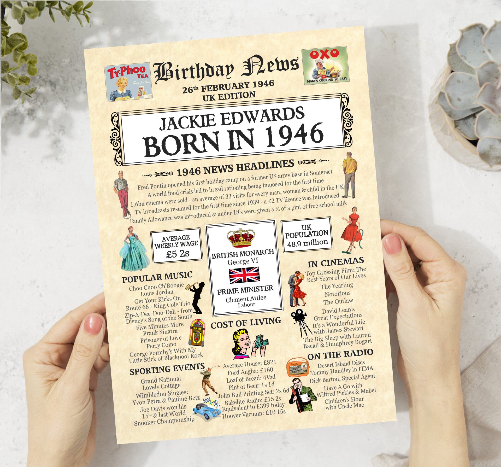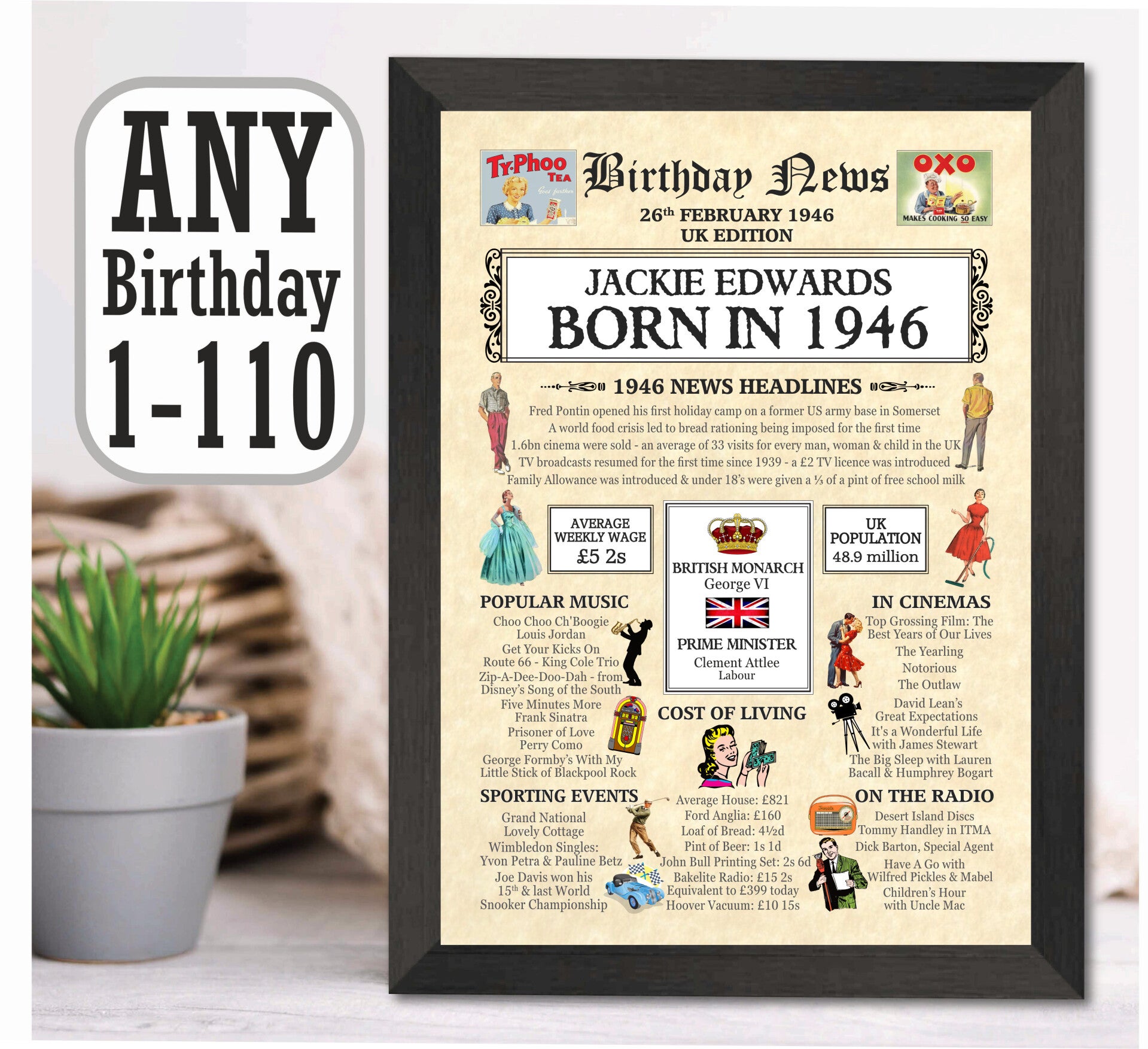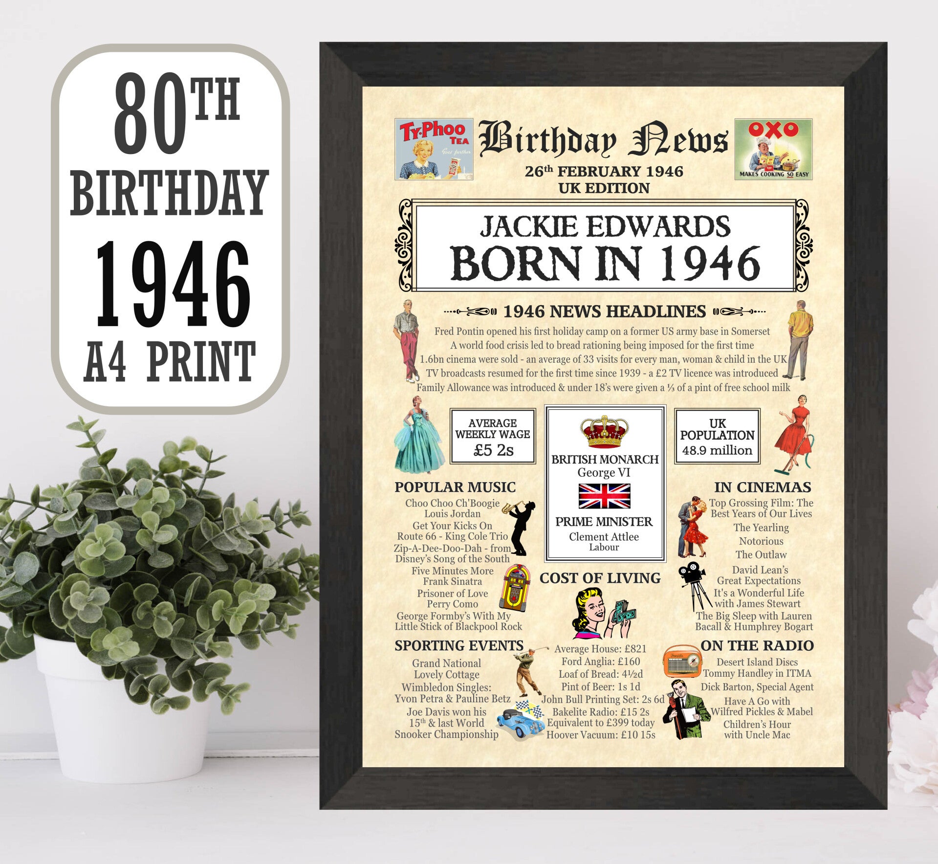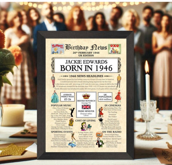 Give them a Nostalgic Journey through time with this Personalised 80th Birthday Gift - a 1946 Day You Were Born Print packed full of more than 50 facts & events from when they were born