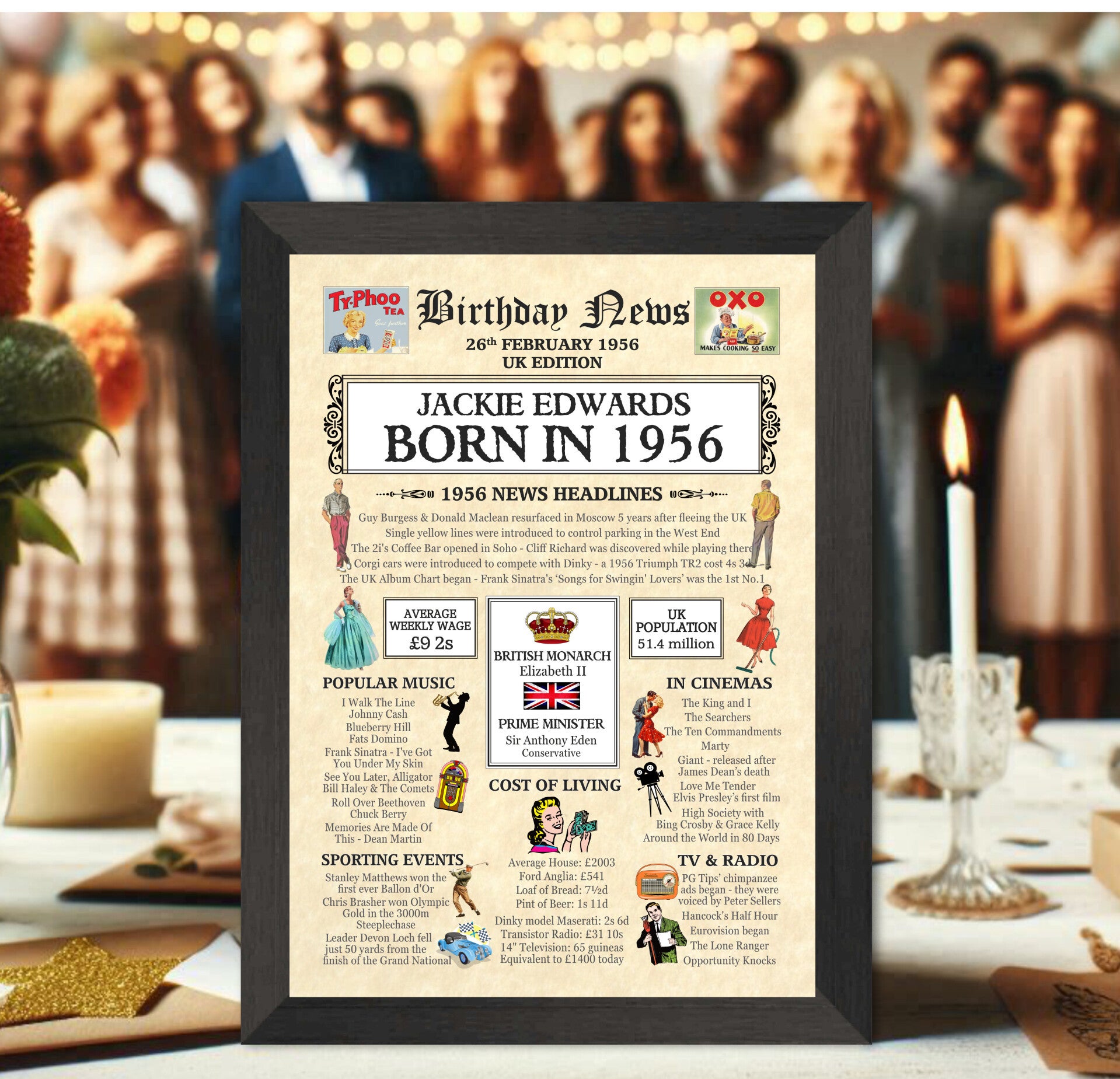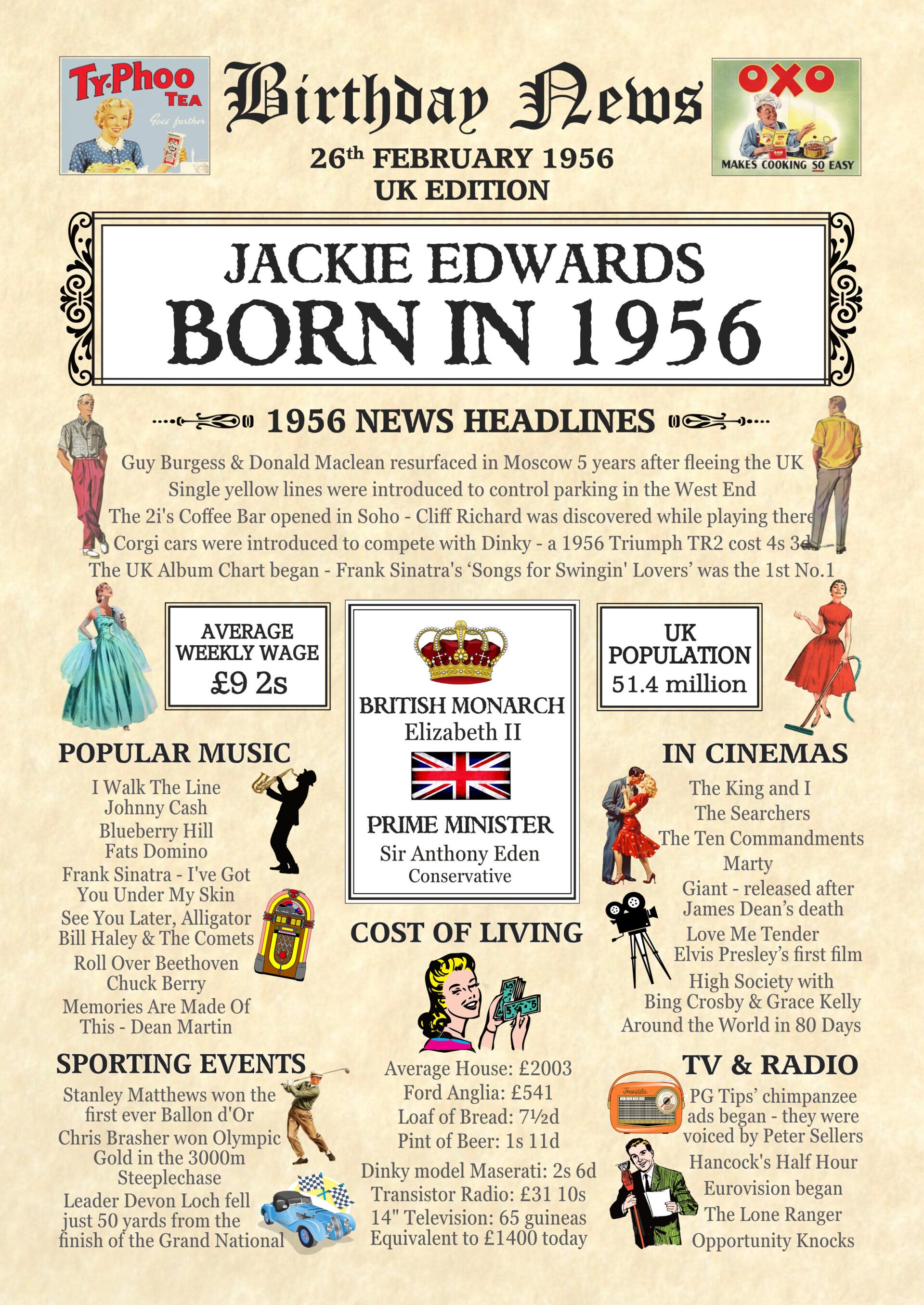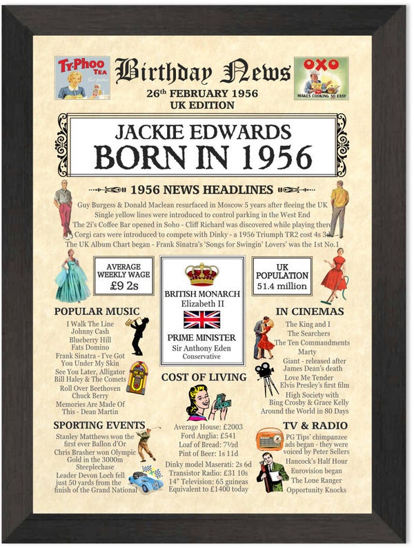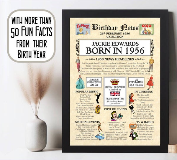 Give them a Nostalgic Journey through time with this Personalised 70th Birthday Gift - a 1956 Day You Were Born Print packed full of more than 50 facts & events from when they were born