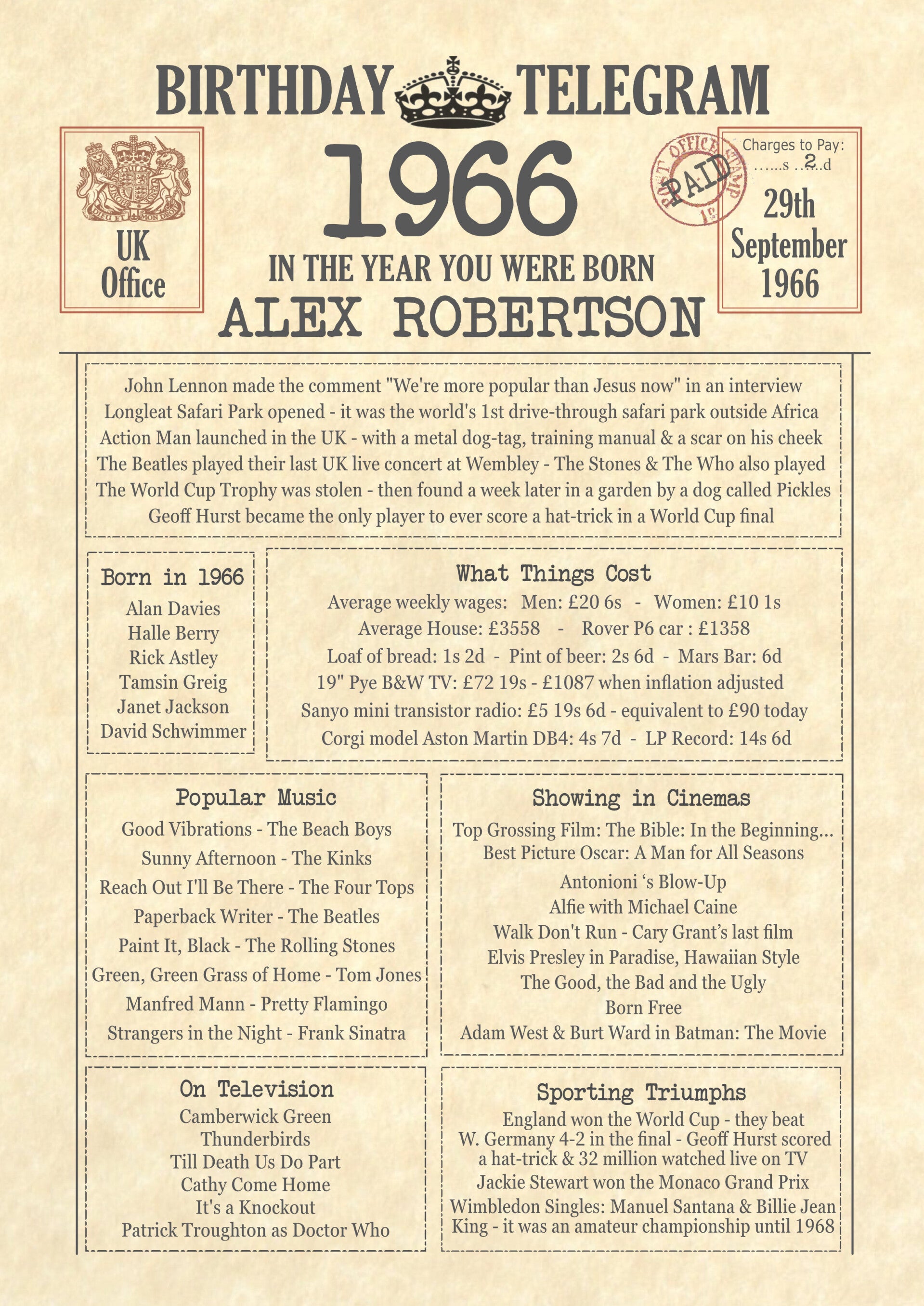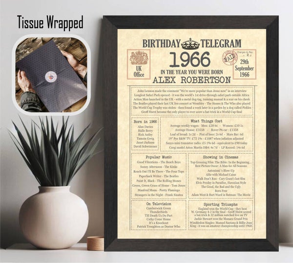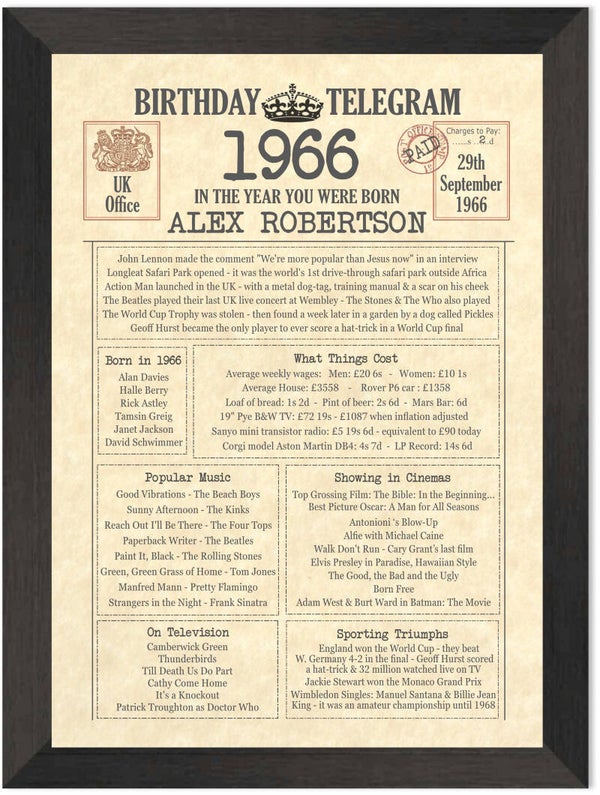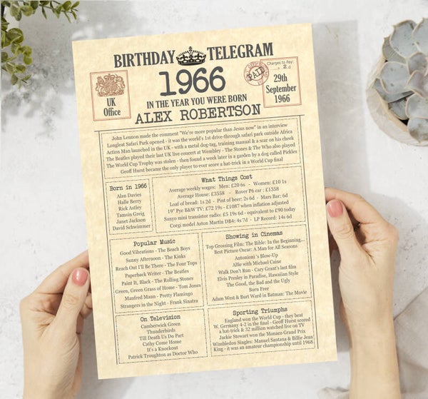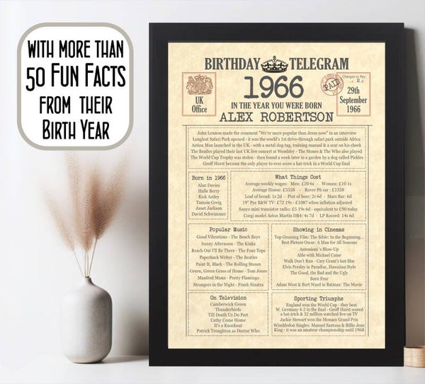 Give them a Nostalgic Journey through time with this Personalised 60th Birthday Gift - a 1966 Day You Were Born Print packed full of more than 50 facts & events from when they were born