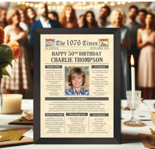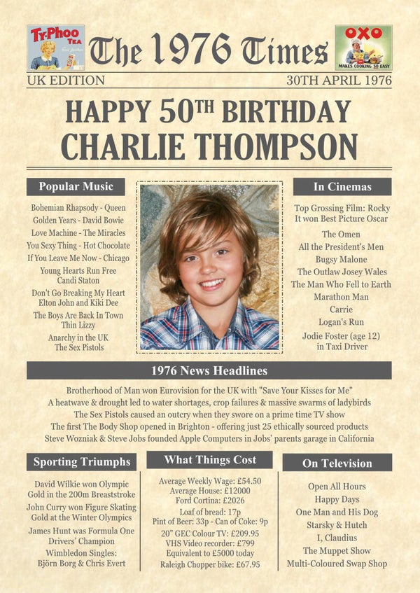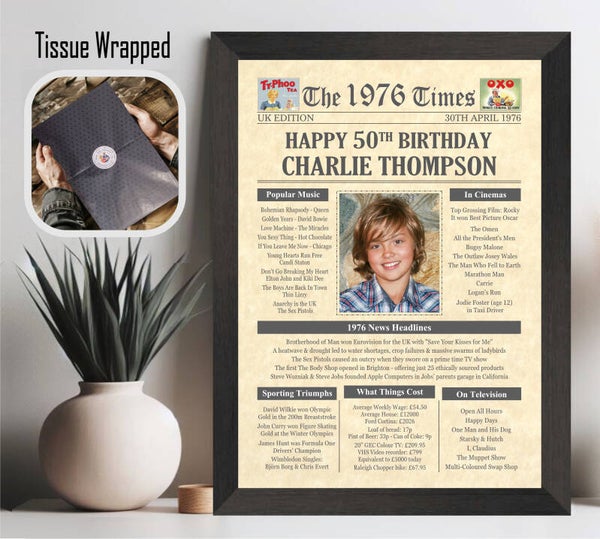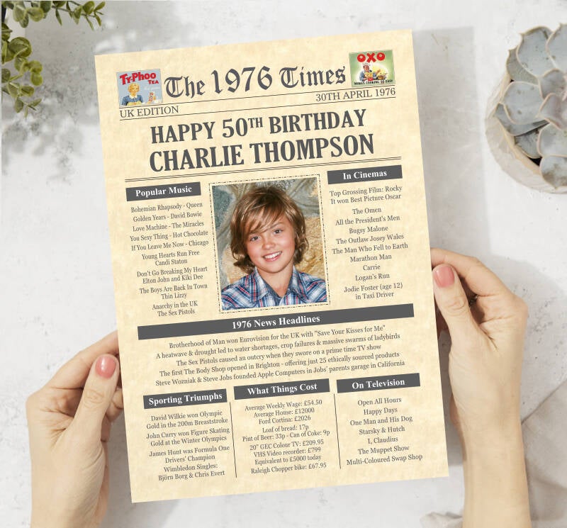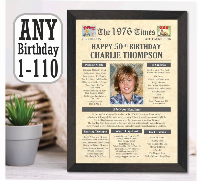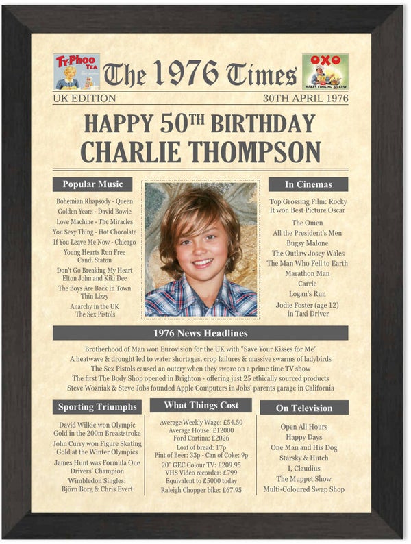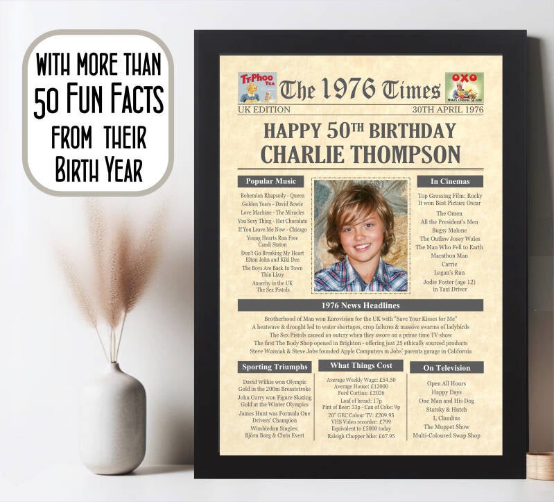 Give them a Nostalgic Journey through time with this Personalised 50th Birthday Photo Gift - a 1976 Day You Were Born Print packed full of more than 50 facts & events from when they were born