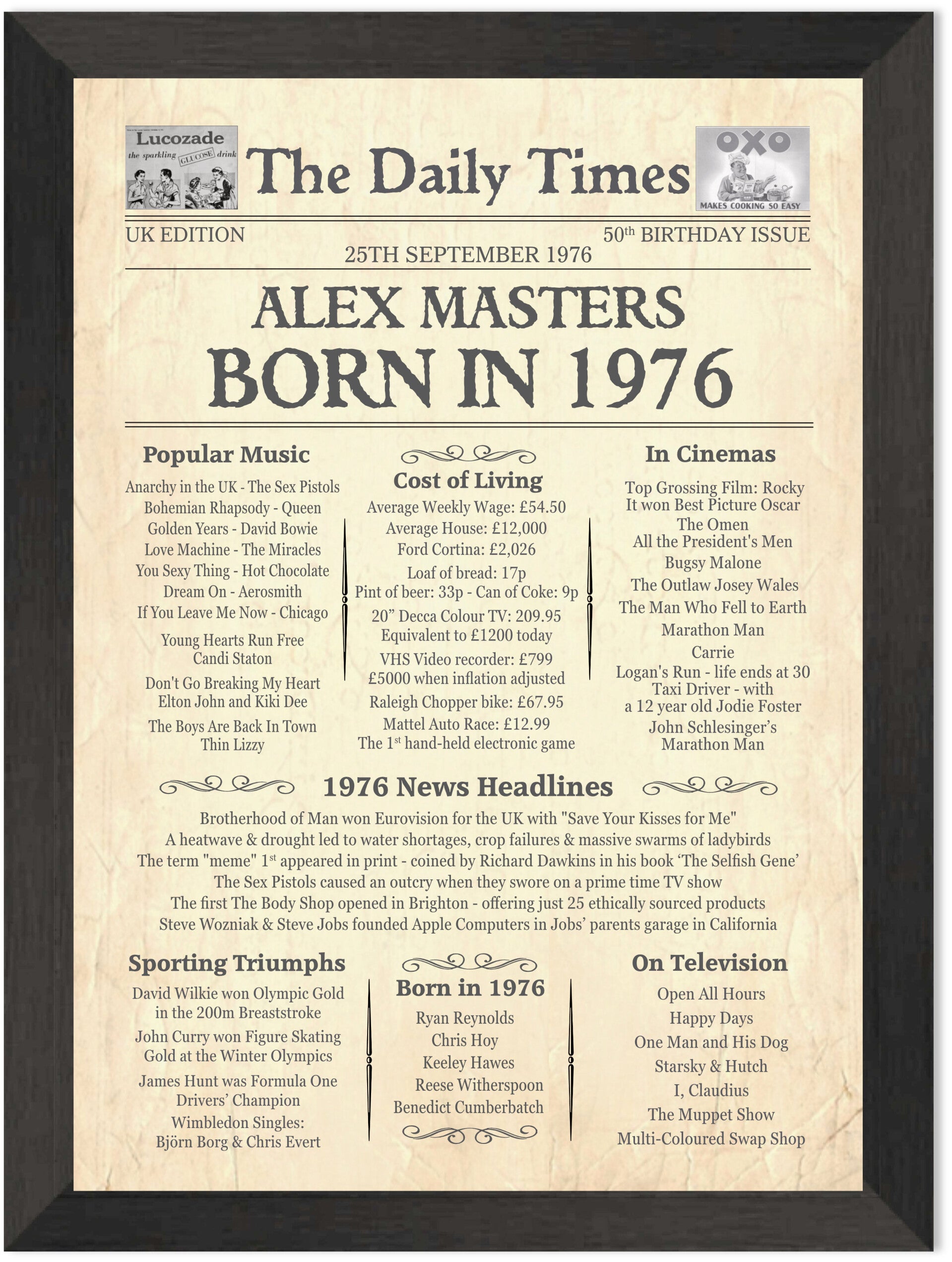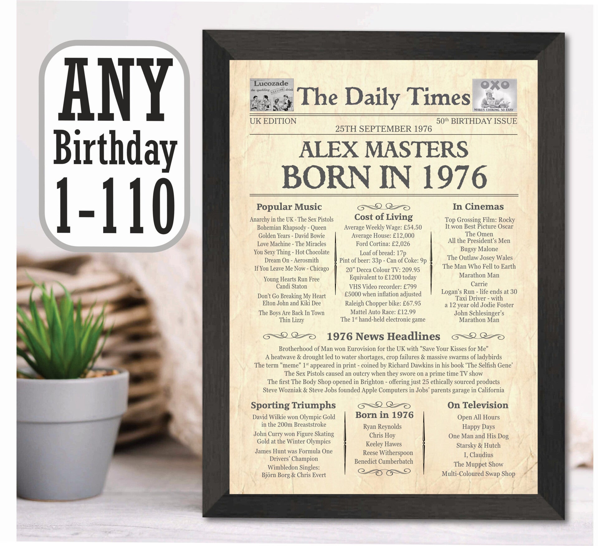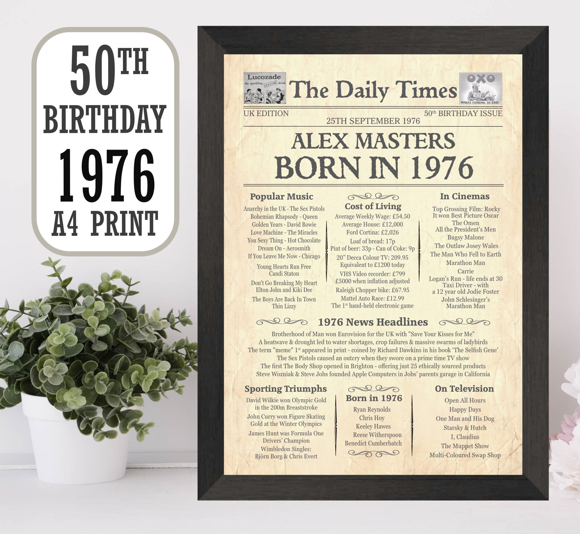 Give them a Nostalgic Journey through time with this Personalised 50th Birthday Gift - a 1976 Day You Were Born Print packed full of more than 50 facts & events from when they were born