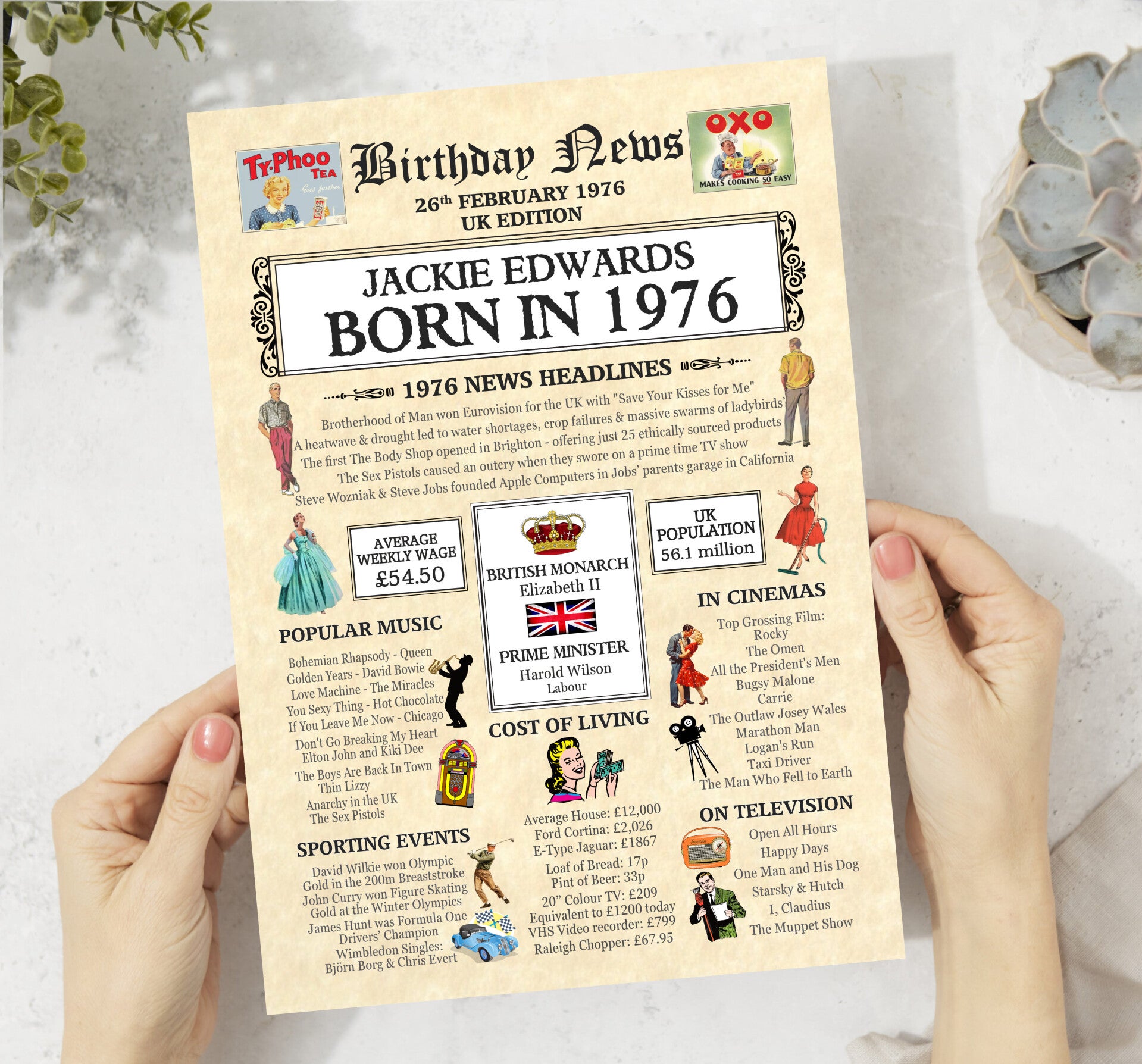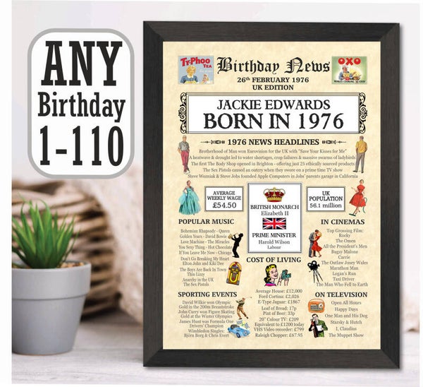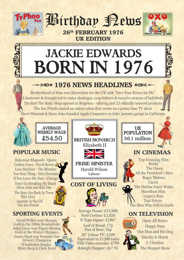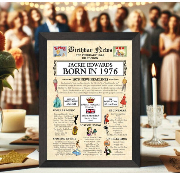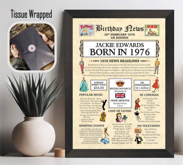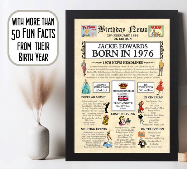 Give them a Nostalgic Journey through time with this Personalised 50th Birthday Gift - a 1976 Day You Were Born Print packed full of more than 50 facts & events from when they were born