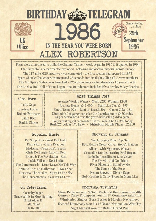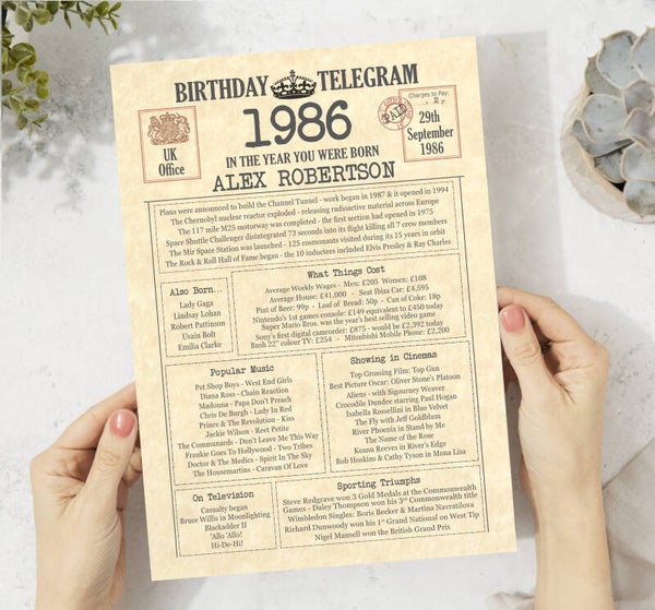 Give them a Nostalgic Journey through time with this Personalised 40th Birthday Gift - a 1986 Day You Were Born Print packed full of more than 50 facts & events from when they were born