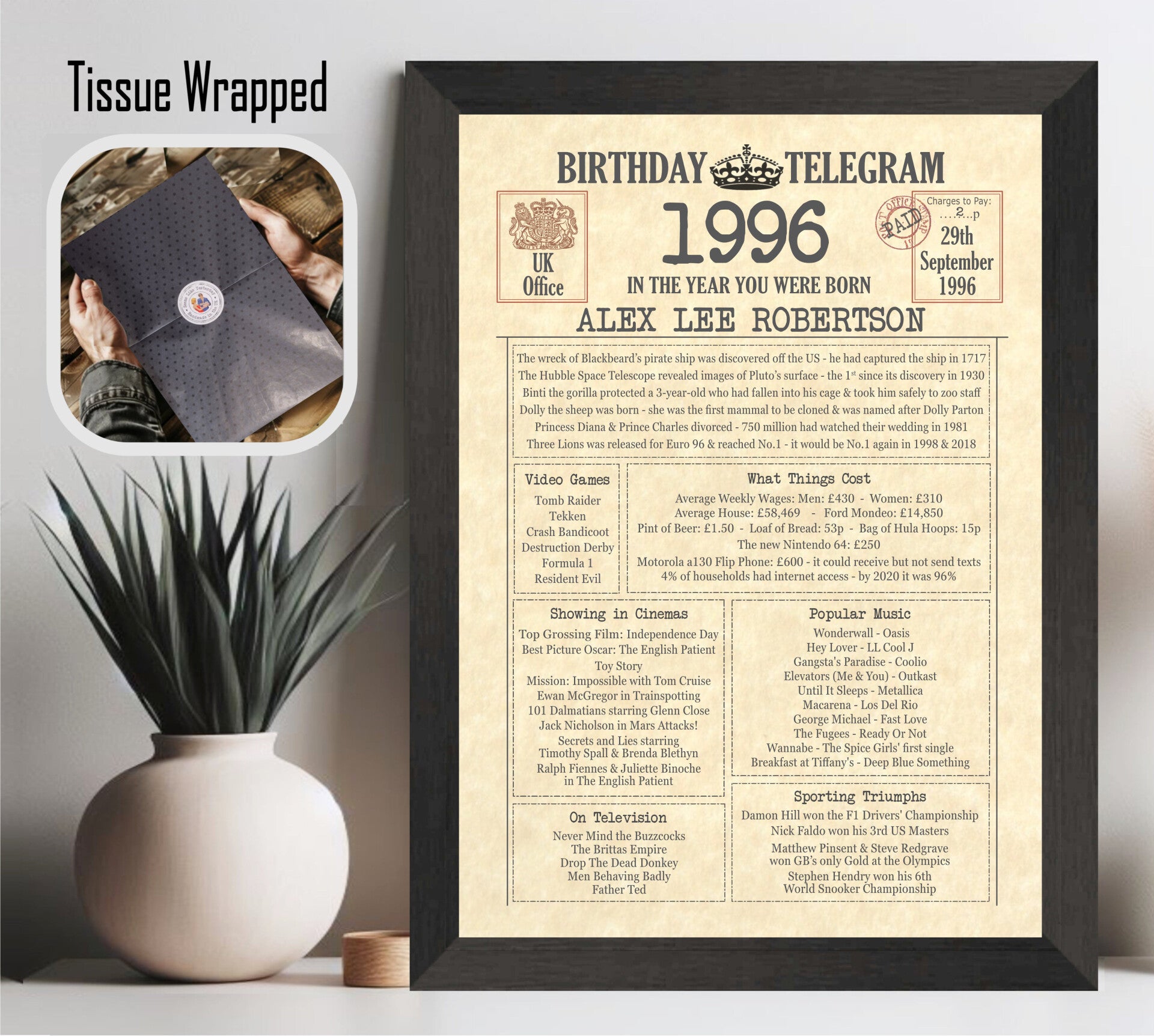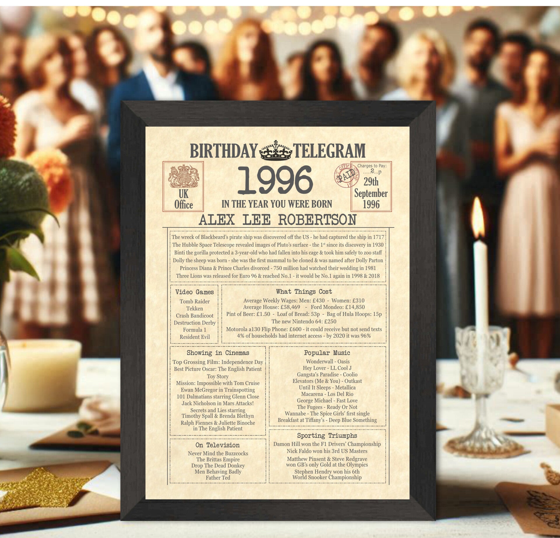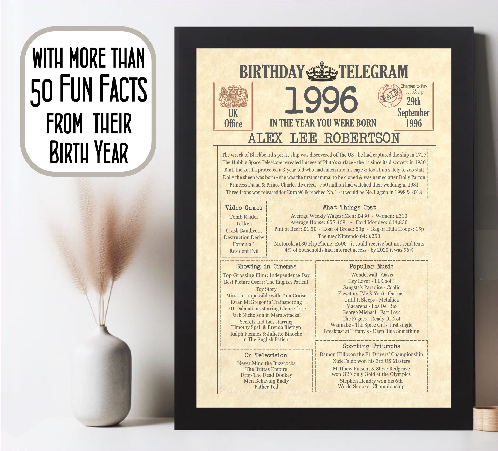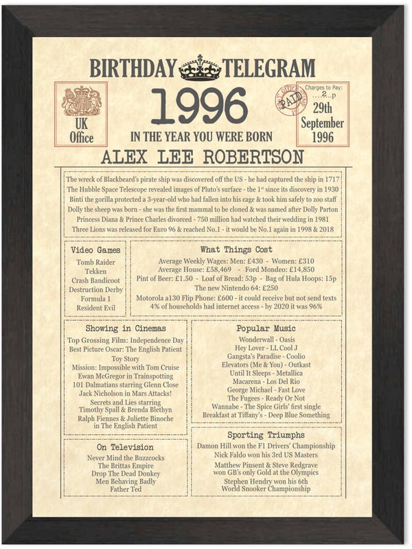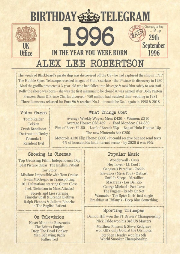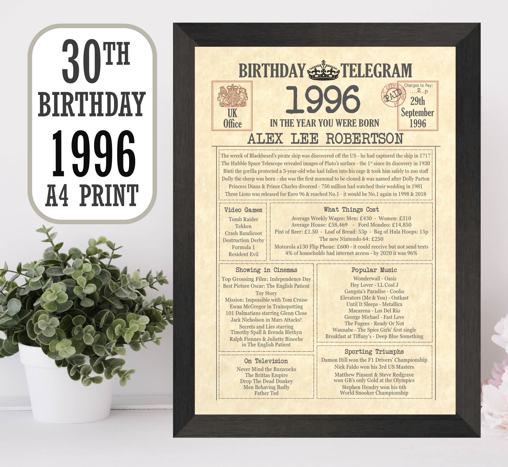 Give them a Nostalgic Journey through time with this Personalised 30th Birthday Gift - a 1996 Day You Were Born Print packed full of more than 50 facts & events from when they were born