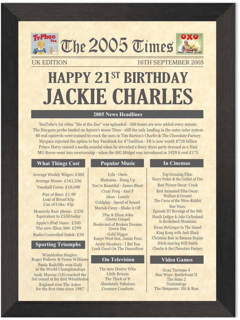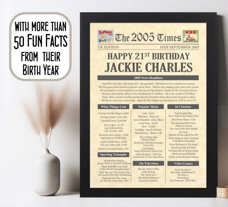 Give them a Nostalgic Journey through time with this Personalised 21st Birthday Gift - a 2005 Day You Were Born Print packed full of more than 50 facts & events from when they were born