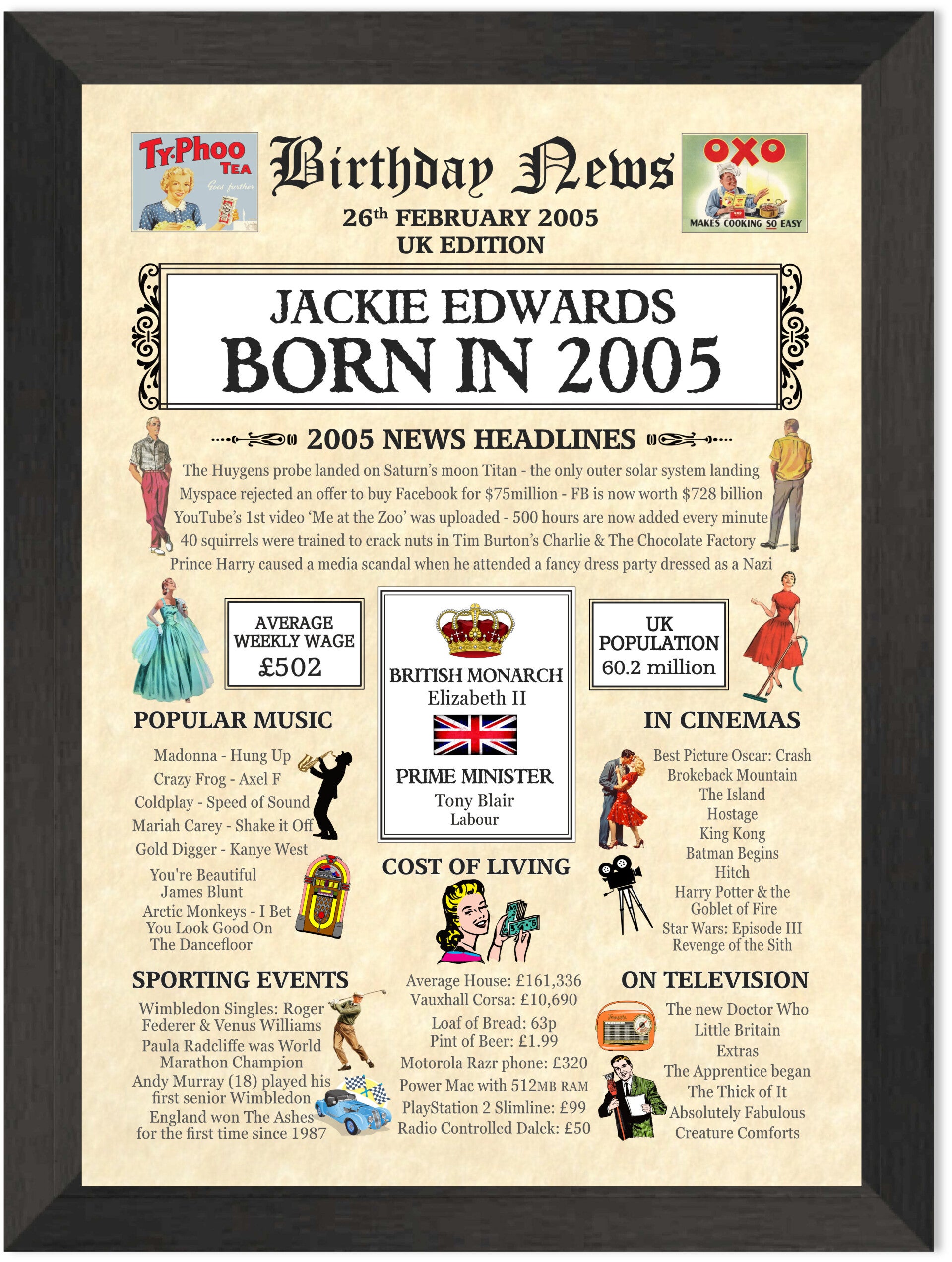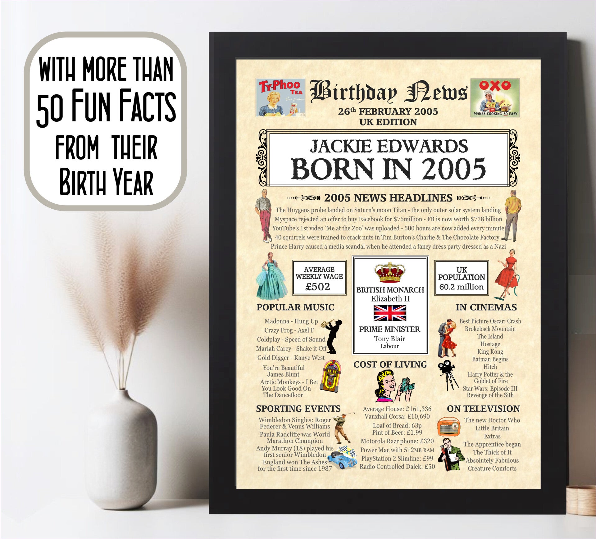 Give them a Nostalgic Journey through time with this Personalised 21st Birthday Gift - a 2005 Day You Were Born Print packed full of more than 50 facts & events from when they were born