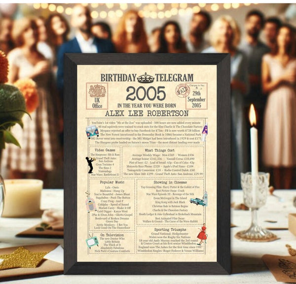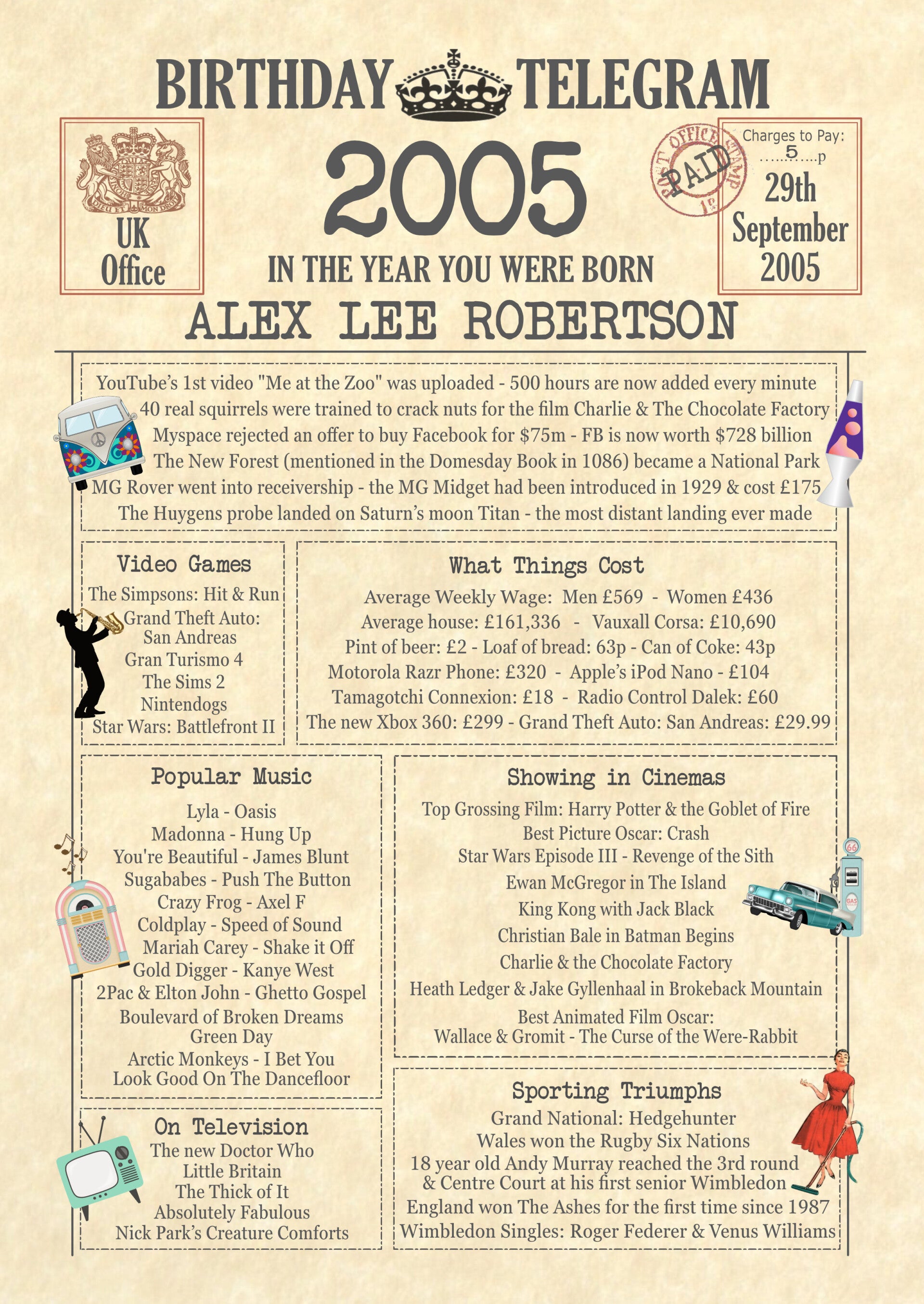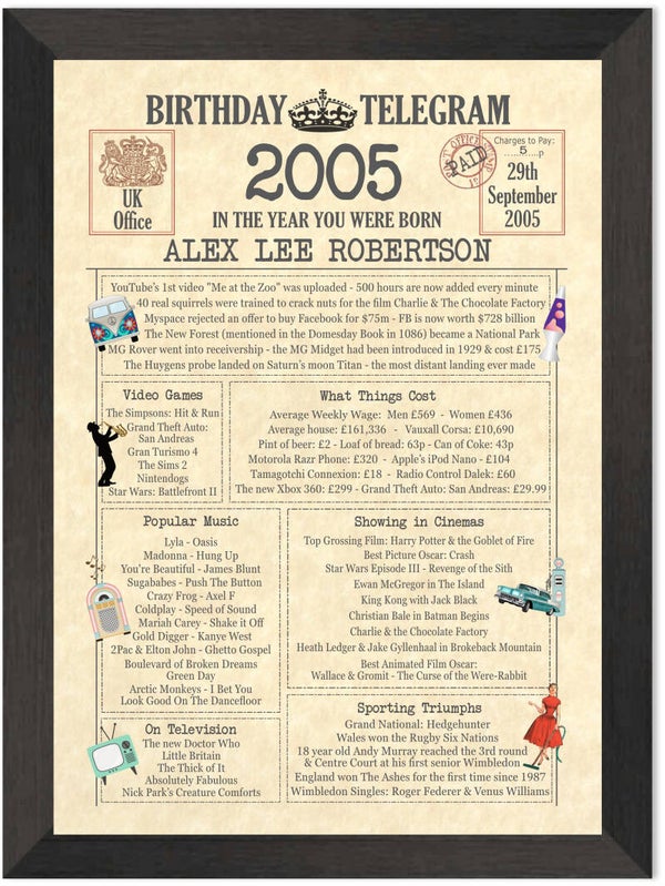 Give them a Nostalgic Journey through time with this Personalised 21st Birthday Gift - a 2005 Day You Were Born Print packed full of more than 50 facts & events from when they were born