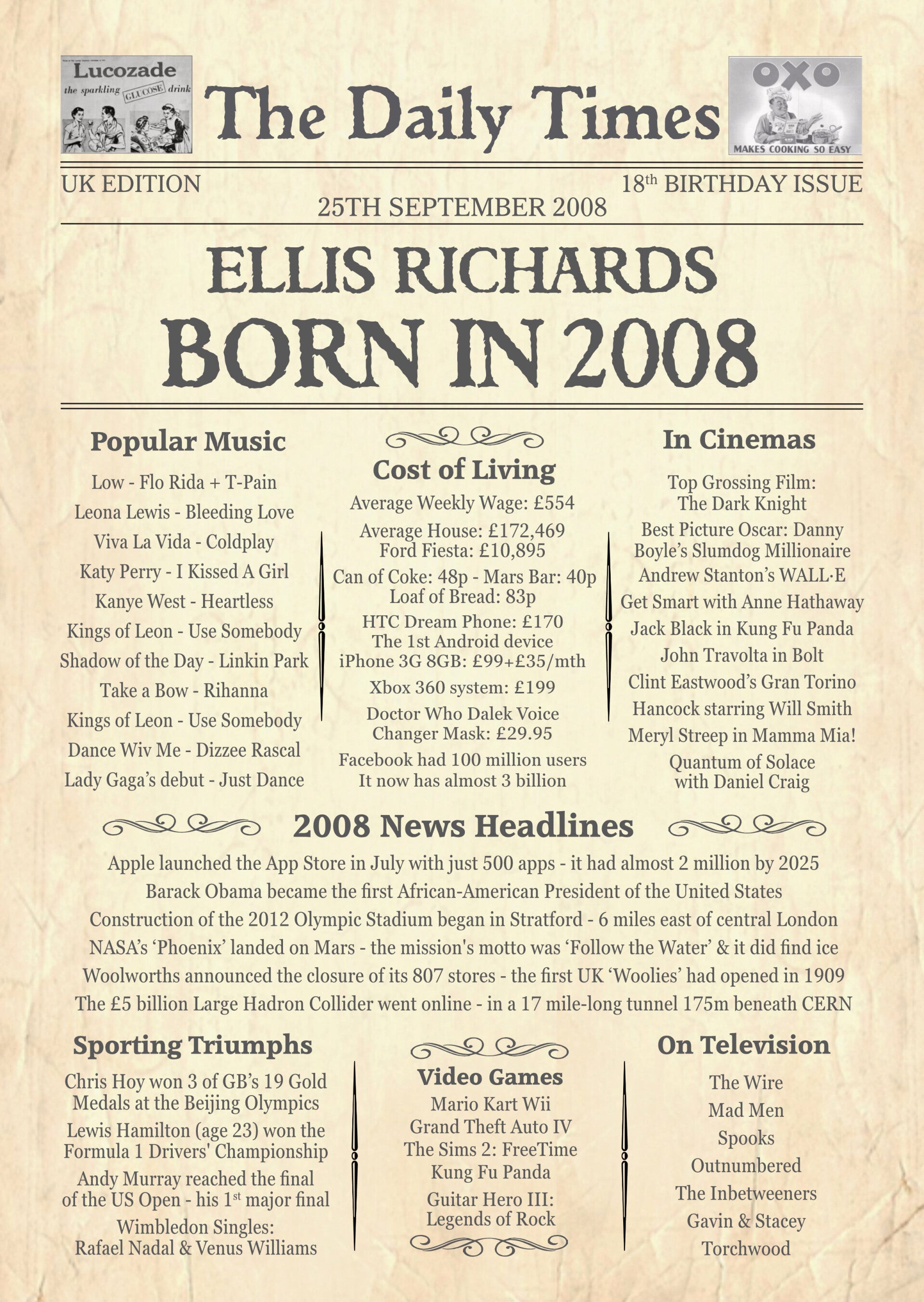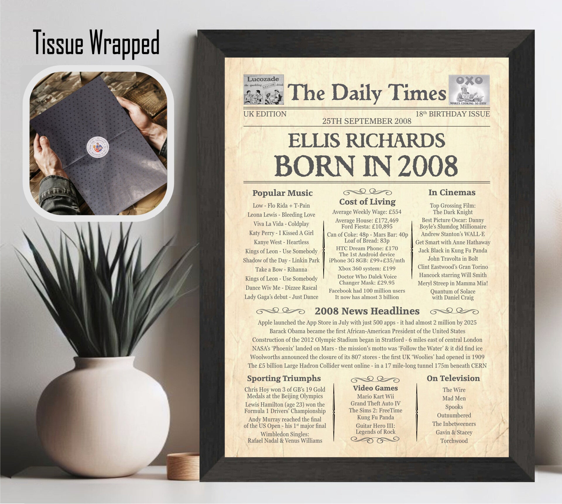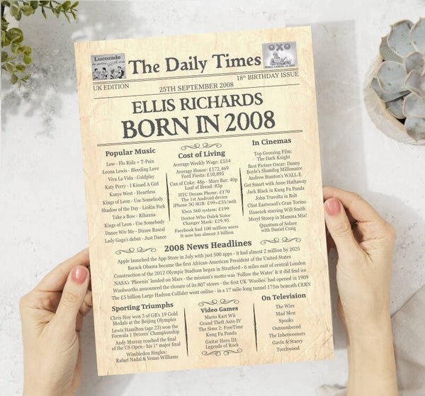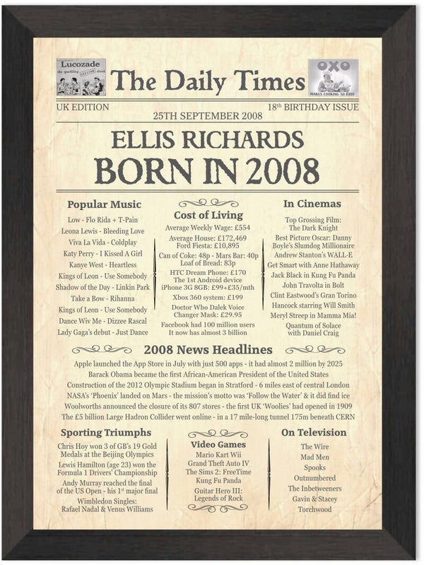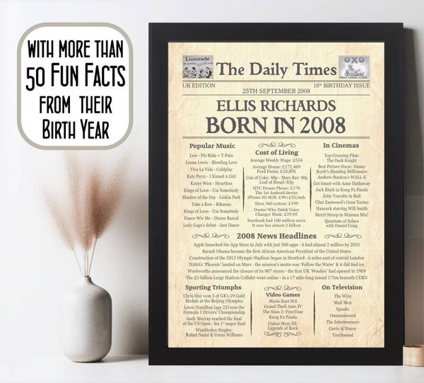 Give them a Nostalgic Journey through time with this Personalised 18th Birthday Gift - a 2008 Day You Were Born Print packed full of more than 50 facts & events from when they were born