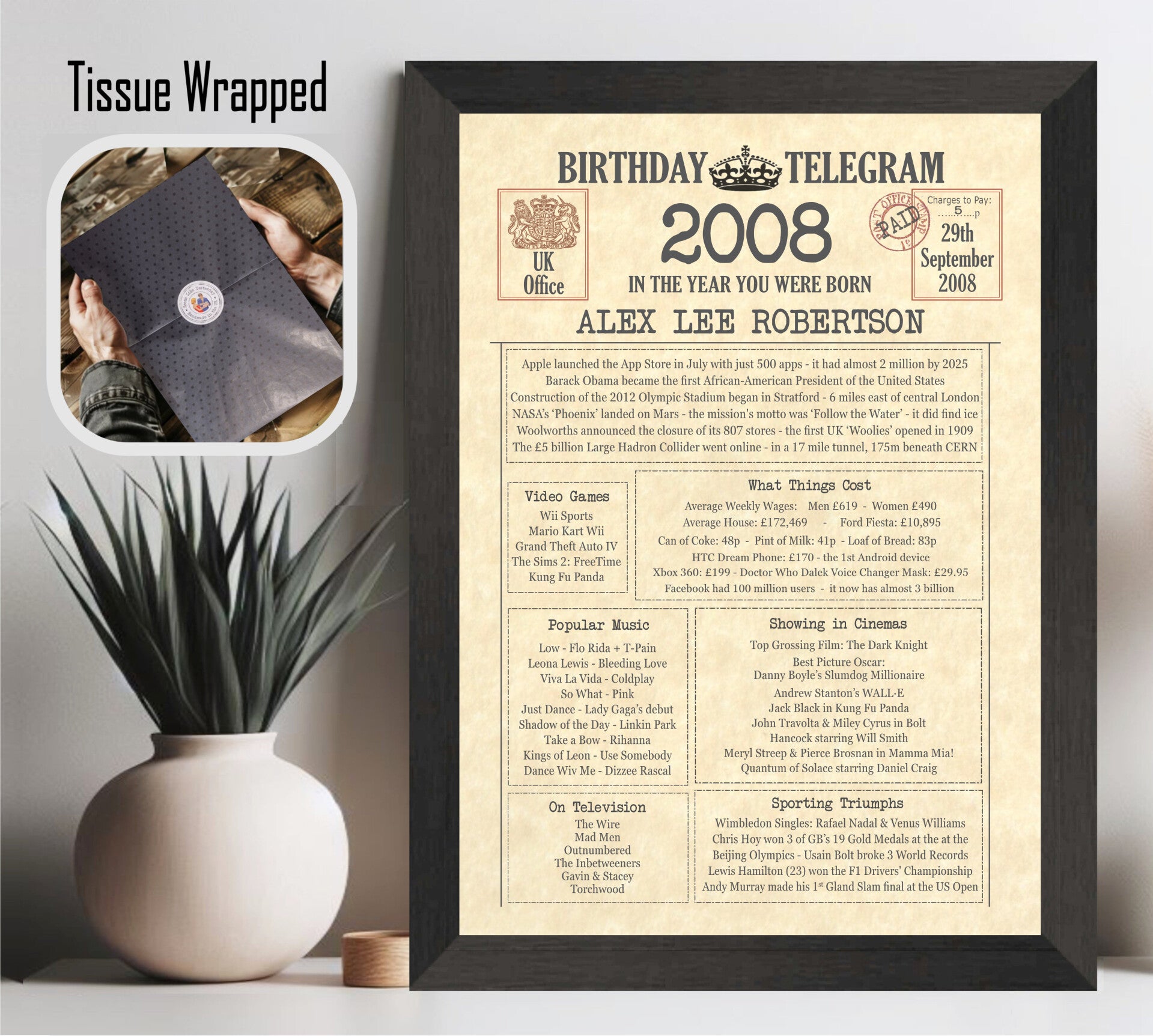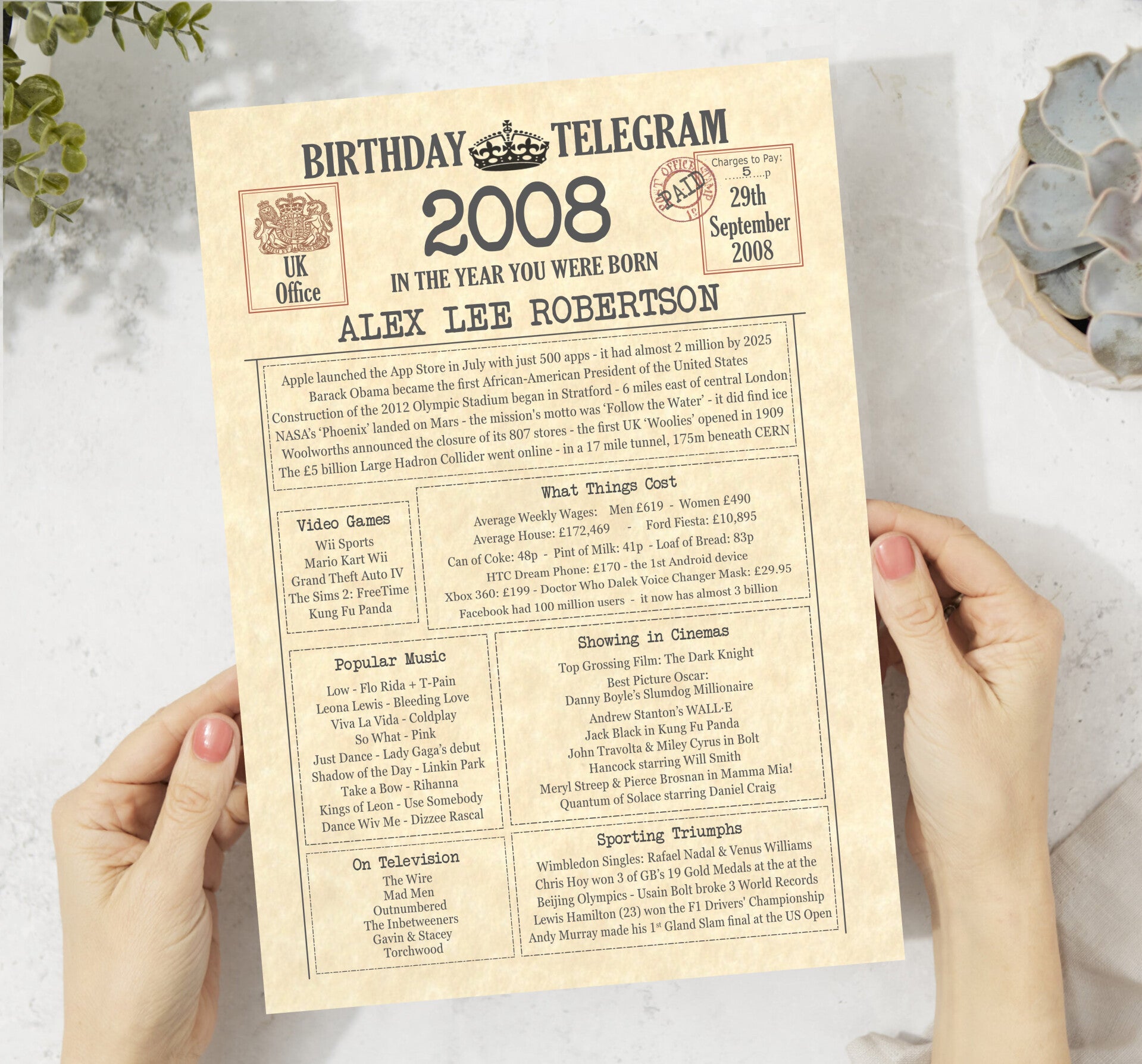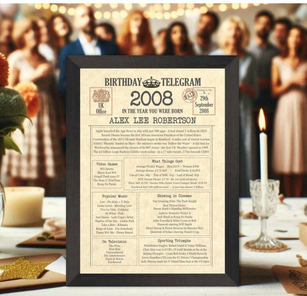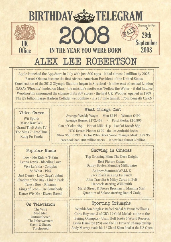 Give them a Nostalgic Journey through time with this Personalised 18th Birthday Gift - a 2008 Day You Were Born Print packed full of more than 50 facts & events from when they were born